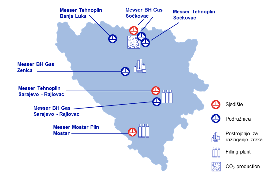 Messer BH Gas osnovan je 2007. godine. Sjedište društva je u Sočkovcu, Opština Petrovo, a u Zenici se nalazi podružnica sa postrojenjem za razlaganje zraka koje je izgrađeno po najsuvremenijim svjetskim metodama. Osnovna sirovina je zrak, a proizvodi su sastavni dijelovi zraka: kisik, argon i dušik.